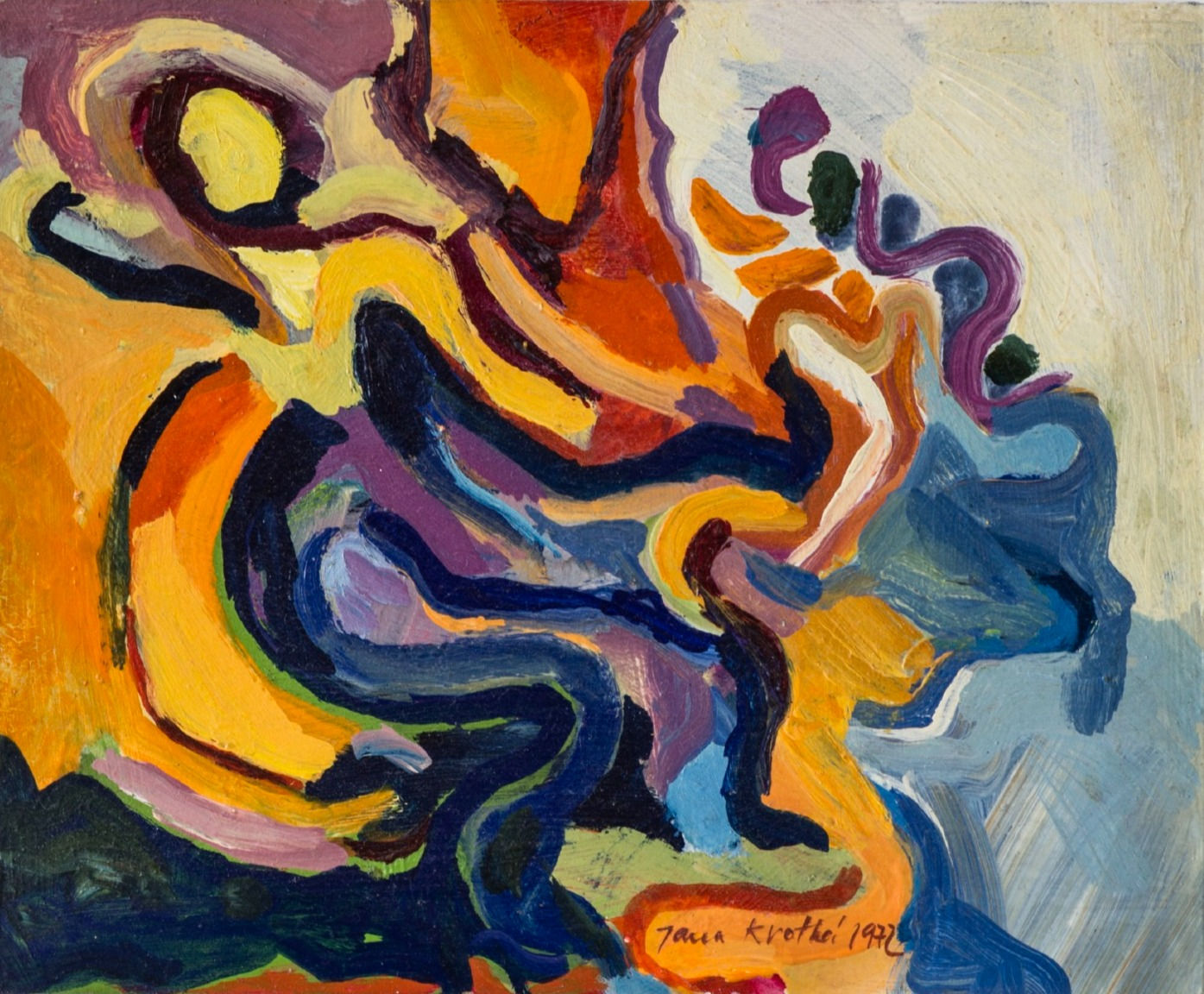"Nemá modely, maluje portréty svého muže, dětí, přátel a známých, nebo figurální kompozice z hlavy, prostě na podkladě vlastní umělecké zkušenosti a imaginace. Její obrazy člověka ztvárňují zejména motiv ženy, ale také milenecké dvojice, děti, ženu s dítětem, nebo jen figuru muže. Portréty, které znázorňují většinou jen hlavu muže či ženy jsou někdy nekonvenčně malovány jako detail ležící figury (vlastně ležící hlavy). např. Hlava muže, nebo Portrét dívky se psem. Lineární kresebnost štětce je doplněna expresivní barevností až fauvistického charakteru. Malířka se nebojí klást vedle sebe plochy ostrých baev a oddělit je důraznou linkou v jiné barvě. Její hlavy mají především výrazné oči. Ty dávají charakter a výraz celému portrétu, postavě či kompozici. Dívají se na nás jakoby se ptaly, nebo jen zvědavě pokukují? Lyrika a poezie je v těch obrazech vidět na první pohled a nemusí být ani zdůrazněna květy, které Jana často maluje. Žena je v kolekci obrazů ve dvou polohách, jako žena-milenka, družka mužova a jako matka, která s láskou vzhlíží ke svému dítěti (např. Obraz Madony). Autorka maluje tváře i celé postavy většinou z profilu, nebo z tříčtvrtečního pohledu, zřídka en face. Silně expresivně malované dvojice působí svojí vitalitou, překypujícím životem prýštícím z jejich těl. Některé obrazy Milenců jsou naopak až mystického charakteru a upomínají vzdáleně na nostalgická díla Munchova (Schoulení milenci). Obraz Velcí milenci naopak připomíná Picassovo modré a růzové období v pevné konstrukci tvaru, zejména řešení hlav, oří a konstrukci v jednom plánu. Jana Krotká je ale svá. Její vlastní malířský výraz spojuje na první pohled všechny vystavené obrazy v jednotný celek působící hlavně emocionálním dojmem nastavujícím zrcadlo dnešnímu člověku. Je takový, nebo ne? Obrazy Jany Krotké nás k tomu vyzývají, jsou hluboce procítěné a opravdové i když estetizující divák by měl možná připomínky k jejich výtvarné formě, která je otevřená a přímá. Živá barevnost je v plném souladu s výtvarným pojetím námětů a jeho myšlenkou. Jak se vzletně říká obsah i forma vjedno jsou. Prostě jsou to obrazy člověka, které nechtějí nic více a nic méně než být malou tichou oslavou lidských citů a vztahů tak jak je malířka zná a vnímá. A to se jí myslím docela podařilo." - Jiří Karbaš